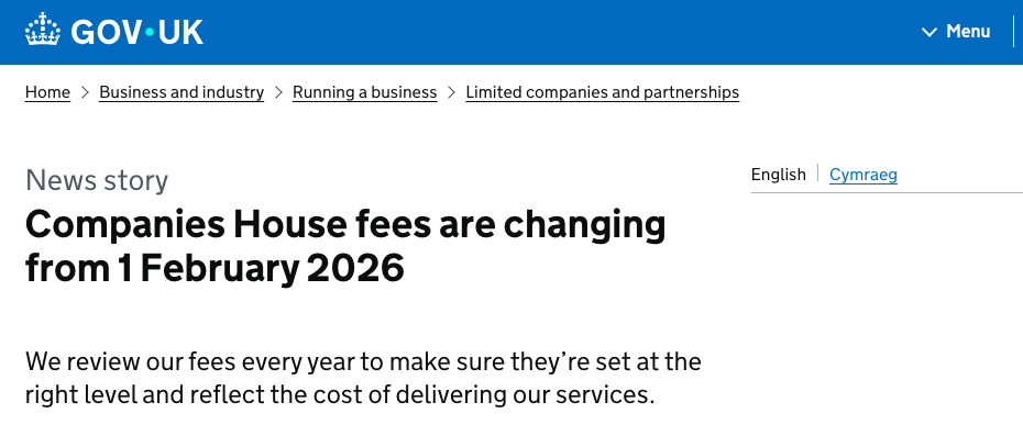 英国公司注册费用预计全面上调100%,近日,英国政府官网与公司法律改革专项页面同步发布了一则关键通知:自2026年2月1日起,Companies House将推行全新的收费标准。