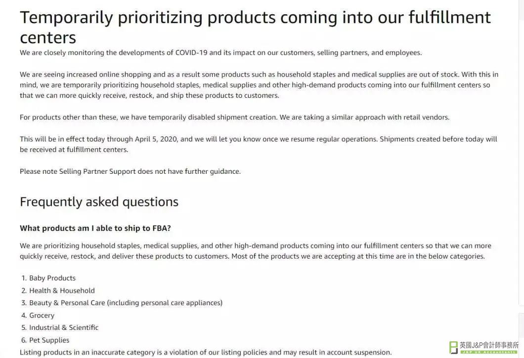 目前亚马逊正在优先考虑进入履行中心的家庭必需品,医疗用品和其他高需求产品,并且只接以下6个类别的商品: