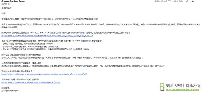 近段时间,不少卖家都有收到了亚马逊要求卖家上传奥地利VAT的邮件通知,邮件内容大致为:请卖家于2020年12月31日之前上传您的奥地利VAT税号,否则您可能会失去在亚马逊奥地利商场的销售权限。