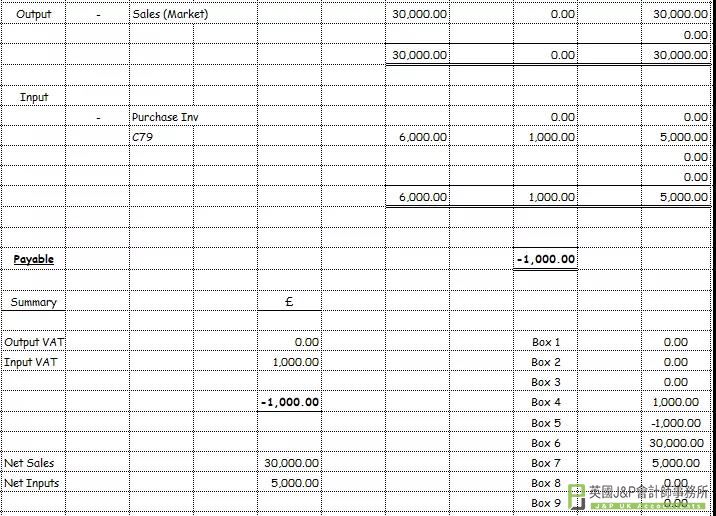 A公司在中国进口了一批货物,支付了1000英镑的进口VAT,并且销售额为30000英镑,那么销售增值税则是30000/6=5000英镑。