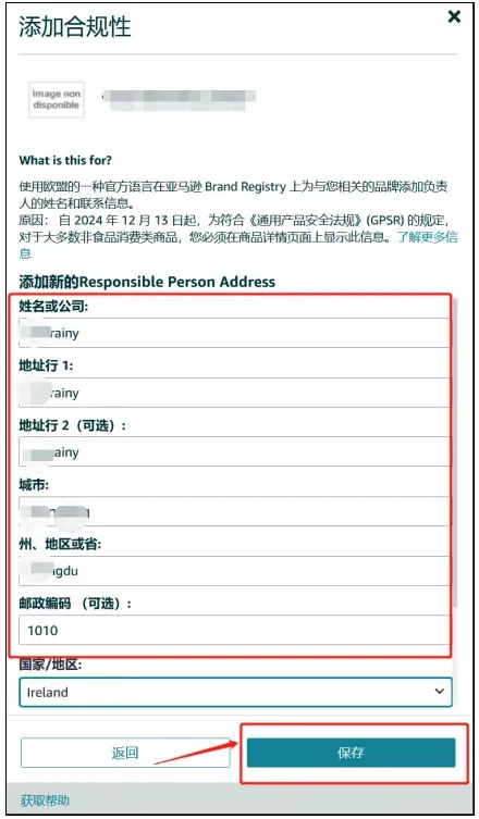 2. 点击「添加新的responsible person address」>完成负责人信息填写>点击右下角「保存」。
